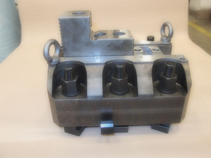 Carusel jaw boxes RSVS-T are more robust and stronger alternative for RSVS jaw box. The inner component are reinforced in order to achieve clamping force more then 100000N in case of maximum tightening torque 1500 Nm. The minimum are, which we are able to RSVS-T offer you, is T-groove pitch 170mm. As like as RSVS line, the body of jaw boxes with locking tools are manufacturing on order due to rotating table dimension of your machine. So it do not mind if the pitch of T-nuts are 180, 200 or 250 mm, we are able to deliver the stronger line of jaw boxes RSVS-T for any pitch, which are larger then 170mm.